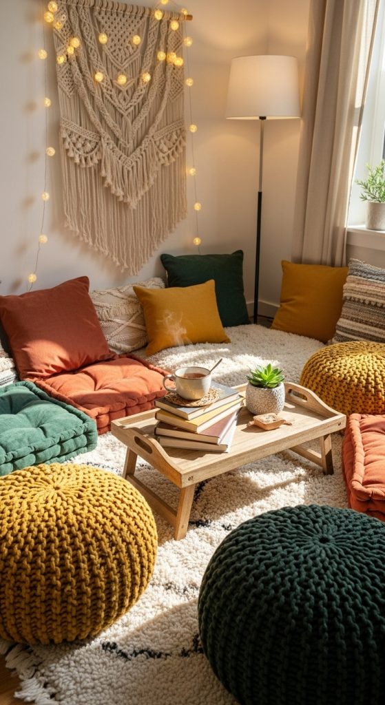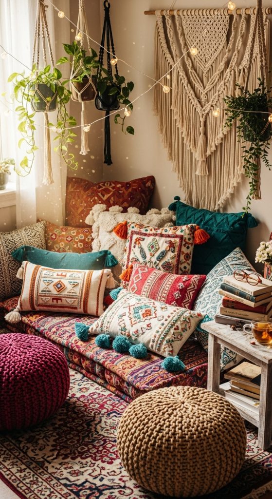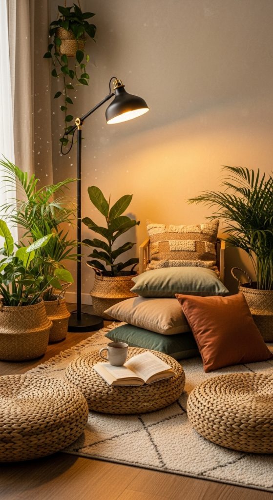 Bohemian-inspired reading corners emphasize eclectic textures, warm tones, and abundant comfort. Start with a patterned rug as the base, and layer large floor cushions, poufs, and throw pillows in varied textures and colors.