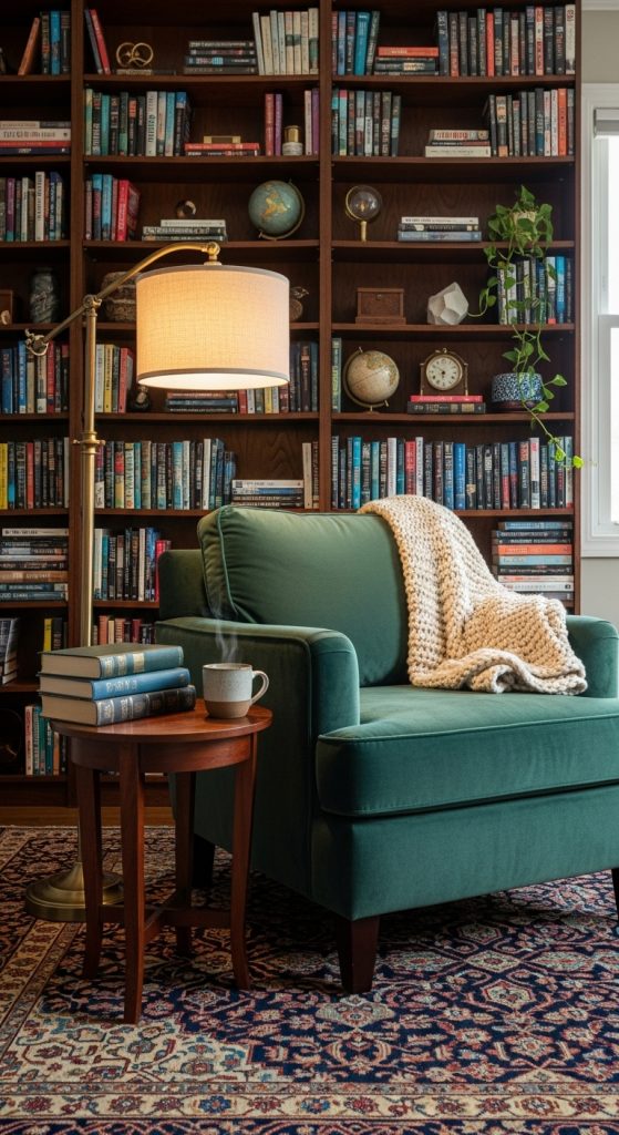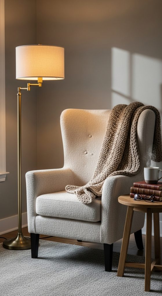 Lighting is critical. A floor lamp with warm light or a table lamp on a nearby side table ensures you have adequate illumination for reading without straining your eyes. Add a small side table to hold your books, a cup of tea, or reading glasses.