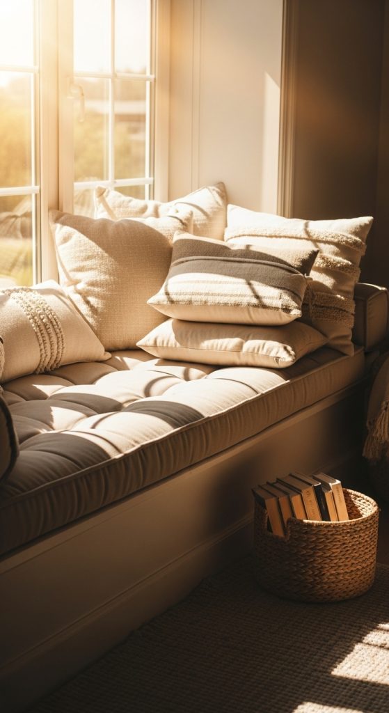Layer textures by combining velvet, cotton, or knit cushions to make the corner visually appealing and physically comfortable. This setup is ideal for both adults and children, offering a serene spot to enjoy morning light or a peaceful sunset.