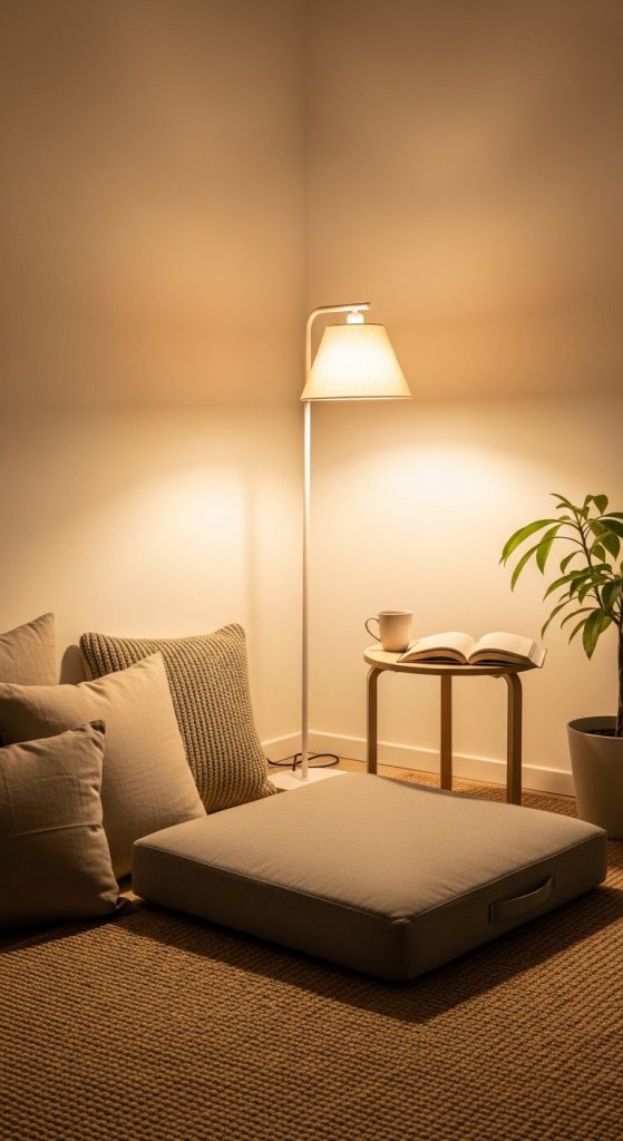 Add a low side table or tray for drinks, books, or snacks. Incorporate a floor lamp with a warm bulb or a hanging pendant light to provide gentle, focused lighting. Floor cushion corners work exceptionally well in apartments or shared spaces where flexibility and space efficiency are important.