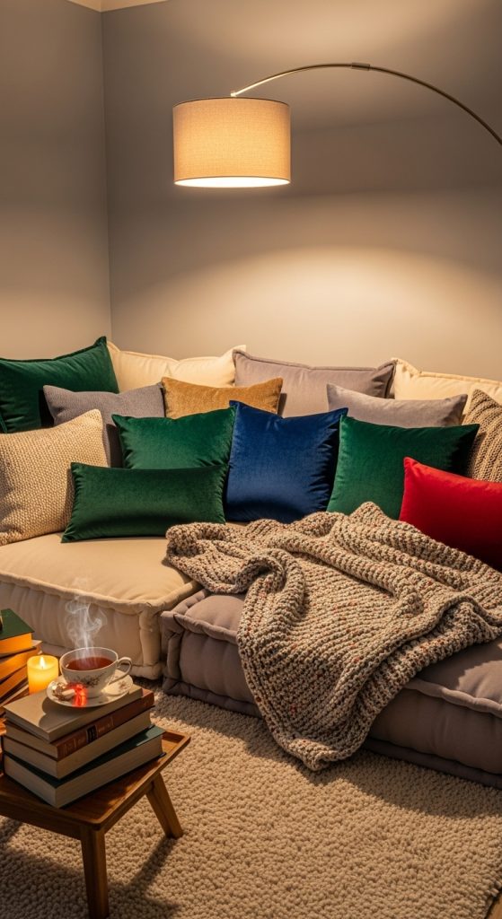 10. Luxurious Pillow and Throw-Filled Corner