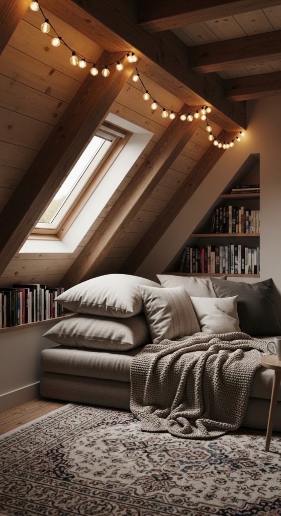 Lighting is crucial in lofts because natural light can be limited. Use string lights along the ceiling beams, a floor lamp, or wall sconces to add warmth. Layer in cozy blankets, a small bookcase, and a tray for tea to complete the corner.