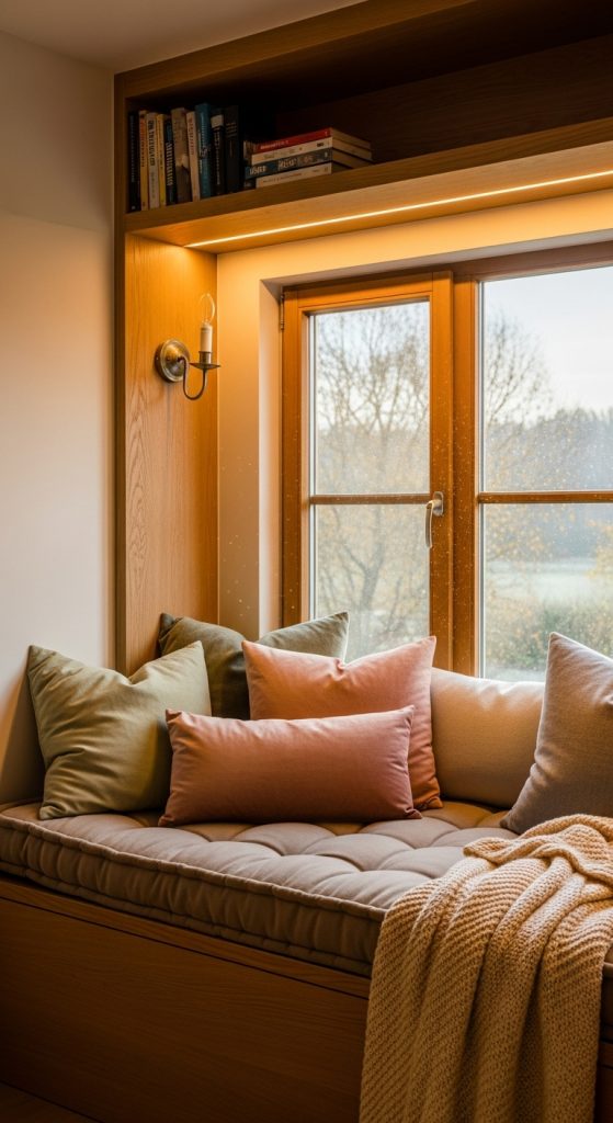 During the day, sunlight illuminates the nook. At night, install a small wall-mounted reading lamp or place fairy lights along the window frame. Keep a small basket for books or magazines, and add a cozy throw to enhance warmth.