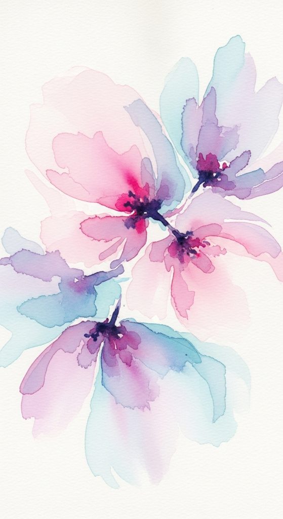 For this painting idea, begin by using soft hues like pastel pinks, purples, blues, and yellows to create a light, airy effect. Let the watercolor bleed and blend into one another, allowing the colors to flow naturally. Focus on shapes rather than intricate details—think of large, soft blossoms, splashes of color, or gentle strokes that represent petals, stems, and leaves.