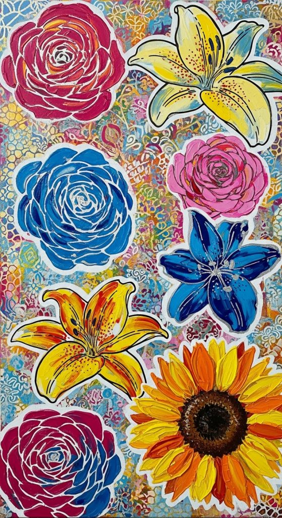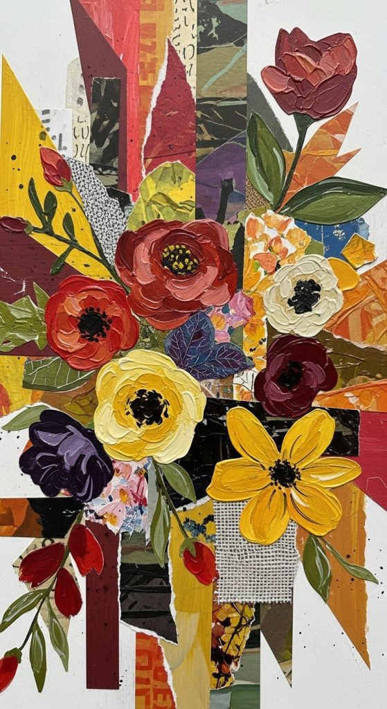 Start by painting large abstract flowers or floral elements with bold colors and brushstrokes. Then, create textured layers by cutting out floral shapes from magazines, textured paper, fabric, or even dried leaves and gluing them onto the canvas. You can overlap painted elements with collage pieces to create a multidimensional effect. This approach adds both visual and tactile texture to your painting, making it truly unique.