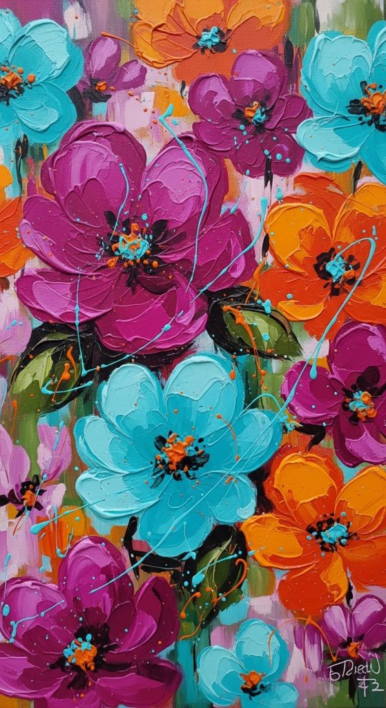 To get started, choose vibrant colors such as sunset orange, rich purples, deep pinks, and bright yellows, and load your brush with plenty of paint. Using a heavy hand, apply broad strokes to create large, expressive petals and leaves. The goal here is not to represent flowers literally, but rather to evoke their feeling, energy, and form through the texture and color.