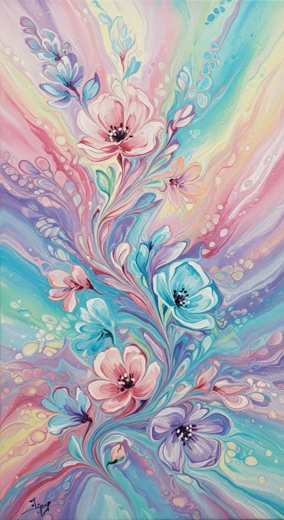 To begin, choose pastel or muted tones like lavender, mint, or peach. Pour the paint in layers across the canvas, letting it flow and mix naturally. Use a palette knife or your hands to encourage the paint to flow in particular directions, creating the feel of petals gently overlapping or moving with the wind.