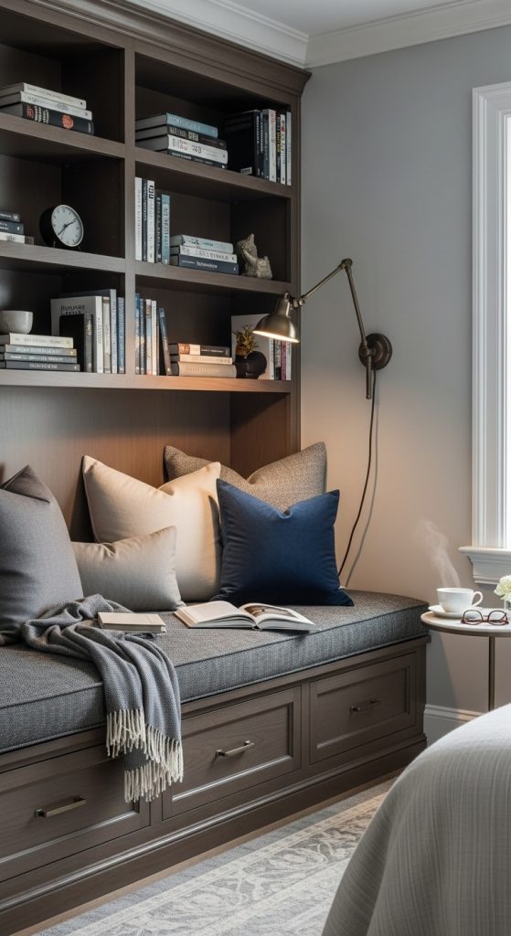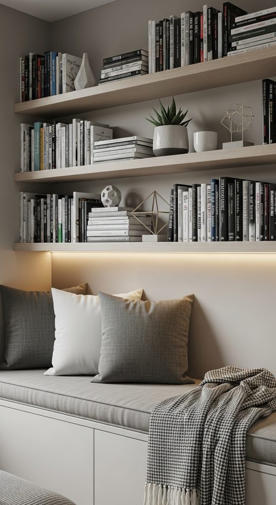 For a modern and space-saving approach, consider a floating shelf and bench combination. A narrow bench placed against the wall can serve as a reading seat, while floating shelves above hold your favorite books and decorative items. Choose cushions and throws in neutral or monochromatic tones for a sleek, minimalist aesthetic. LED strip lighting under the shelves or behind the bench adds subtle ambient light. This idea is perfect for small bedrooms or apartments where space efficiency is essential. It combines practicality and style, offering a contemporary reading corner that is both functional and visually appealing.
