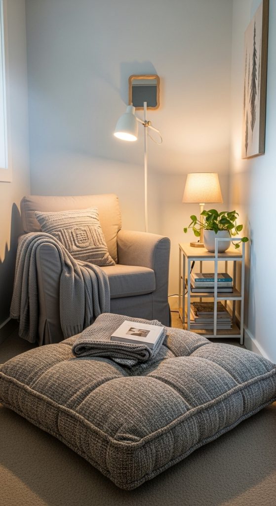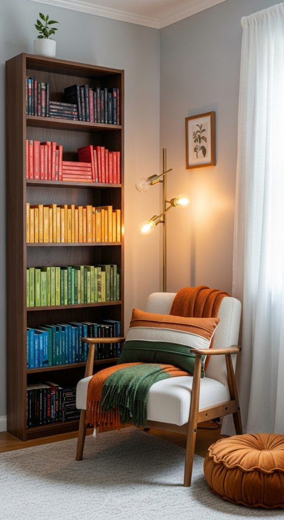 Even small bedrooms can accommodate a cozy book corner. A single armchair or floor cushion, a small stackable bookshelf, and a simple lamp can create a functional and comfortable reading spot. Add a lightweight throw and a few decorative pillows for warmth and visual appeal. Using vertical space for shelving keeps the floor area open, preventing the corner from feeling cramped. This idea is ideal for students, renters, or anyone with limited square footage who still wants a dedicated reading space in their bedroom.