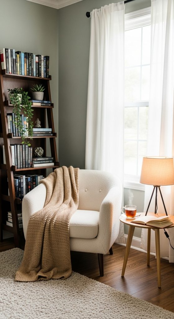 Pair a comfortable armchair with a ladder-style bookshelf to create a simple yet stylish book corner. The ladder shelf can hold books, small plants, or decorative items, and its open design prevents the corner from feeling cramped. Choose a chair with soft upholstery and an ergonomic design to support long reading sessions. A small side table can hold a cup of tea, glasses, or additional books. This setup is perfect for bedrooms where you want a visually appealing corner that balances comfort, functionality, and design.