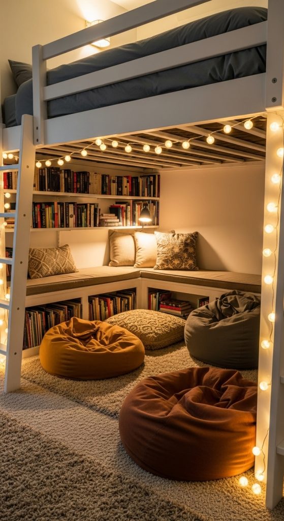 In bedrooms with loft or bunk beds, the space underneath can be transformed into a cozy book corner. Place a low bookshelf, cushioned seating, and soft rugs to create a hidden retreat that feels private and snug. Add floor cushions, bean bags, or even a small loveseat for comfort. String lights or a small table lamp provide sufficient lighting for reading. This type of corner is perfect for teenagers or anyone who enjoys a whimsical, tucked-away reading spot. The loft setup also maximizes room space, making it ideal for shared bedrooms or compact apartments.