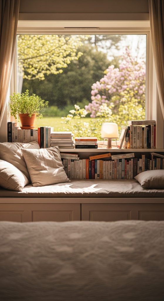 If your bedroom has a wide windowsill, it can be repurposed as a small book nook. Line the ledge with cushions and a thin mattress pad for seating, and stack your favorite books along the sides. Add a small lamp, plant, or decorative item to personalize the space. The natural sunlight during the day creates an inviting atmosphere, and blackout curtains or blinds ensure privacy and adjustable lighting. This idea works exceptionally well for bedrooms with beautiful outdoor views, allowing you to enjoy reading while being connected to nature.