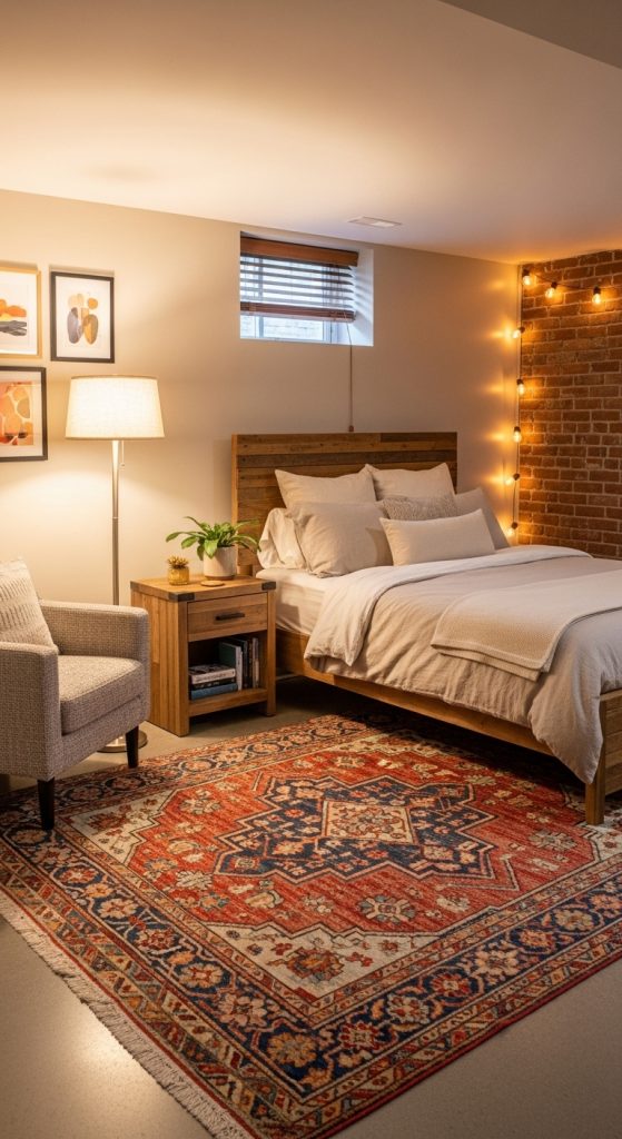 A statement rug can completely transform the look and feel of your basement bedroom. Choose a large, colorful rug that covers the floor, which will instantly add warmth, comfort, and style. A rug with a bold pattern or rich colors can serve as the room’s focal point, drawing attention to the floor and adding personality to the space.