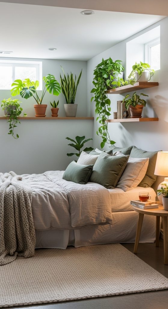Adding plants to your basement bedroom brings a touch of nature into the space, making it feel more fresh and lively. Plants help purify the air and create a calming atmosphere. Choose plants that thrive in low light, such as snake plants, peace lilies, or pothos.