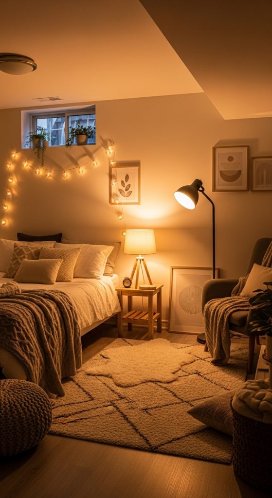 Basement bedrooms often lack the natural light you might find in upper-level rooms, but you can make up for this with layered lighting. Instead of relying on a single overhead light, use a combination of task, ambient, and accent lighting to create a warm and inviting atmosphere.