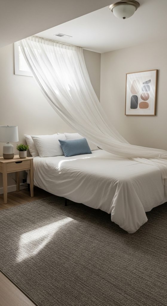 Curtains are a must for any basement bedroom, especially if you’re trying to bring more warmth and light into the room. Choose light, airy fabrics like linen or cotton for a relaxed feel. If you’re dealing with a space that doesn’t have much natural light, consider using floor-to-ceiling curtains to draw attention to the windows and make the room feel more expansive.