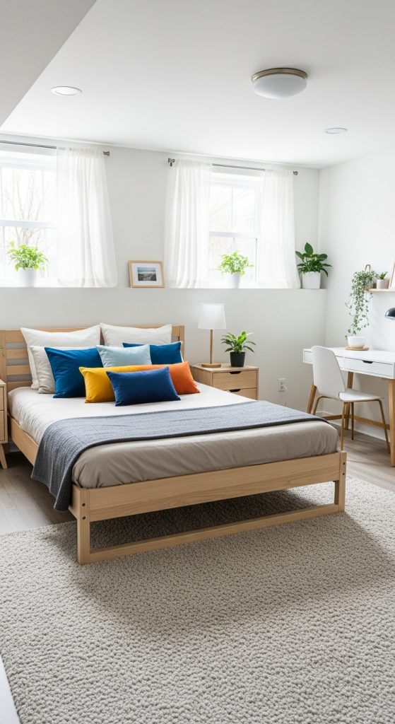Place plants on windowsills, shelves, or hanging baskets to create a relaxed, earthy vibe. Greenery adds life and color to the room, balancing out darker corners and creating a peaceful, serene environment. Plus, plants can serve as natural focal points that elevate the aesthetic of your basement bedroom.