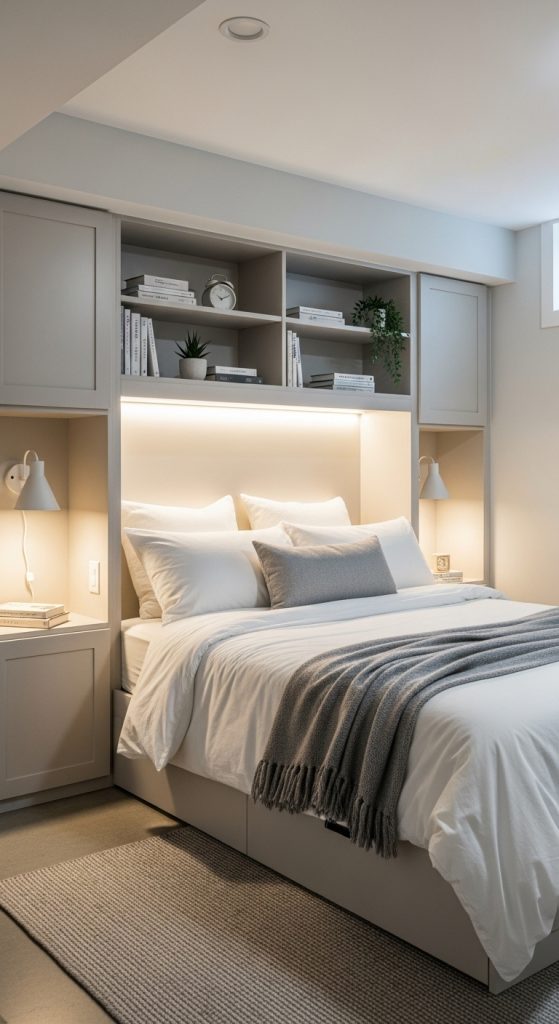 If you have limited space, consider under-bed storage or storage benches at the foot of the bed. These functional yet stylish pieces help maintain a tidy bedroom while providing extra storage for clothes, linens, or other essentials. Built-in storage is especially useful in basement bedrooms, where space is often at a premium.