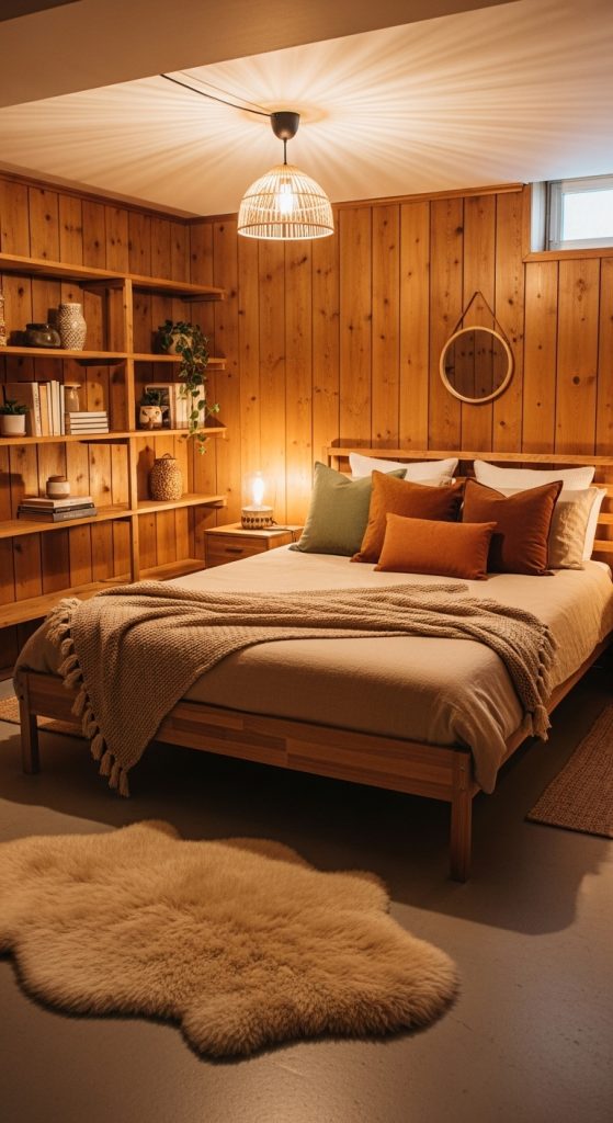 If you’re dealing with concrete or stone floors, consider using wooden flooring or laminate planks to mimic the look of hardwood. You can also add wooden furniture pieces, such as a nightstand, dresser, or a rustic bench at the foot of the bed. Wood paneling on one accent wall can also create a cozy, cabin-like feel. The rich tones of the wood balance the coolness of the basement environment, making the space feel more comfortable and homey.