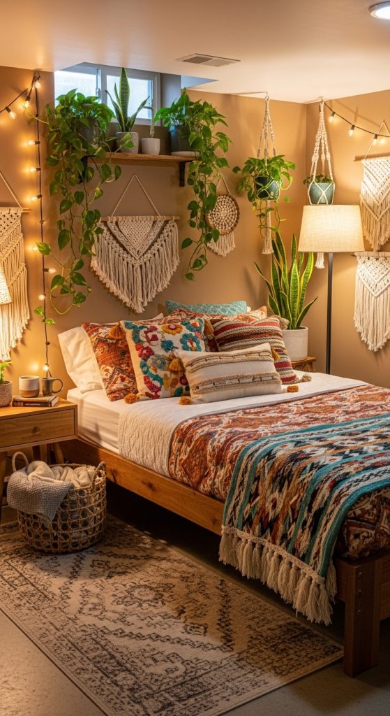 To make the room feel more inviting, use vibrant colors like deep oranges, warm reds, and earthy greens. These hues can help balance the cooler tones in a basement and give the room a warm, welcoming atmosphere. Bohemian decor also encourages a mix of patterns, textures, and colors, so feel free to mix and match to make the space your own.