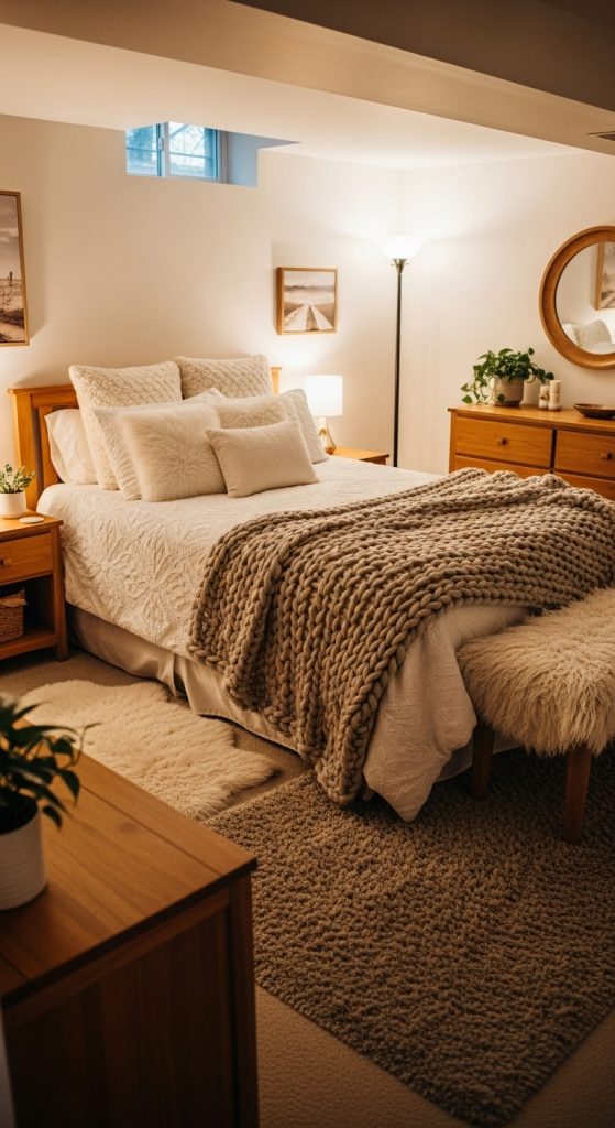Place cozy pillows on the bed and a few more on any seating areas in the room. If you have a lounge chair or reading nook, add a textured blanket or throw to complete the look. The combination of softness and warmth will make the basement feel like a comforting haven, perfect for unwinding.