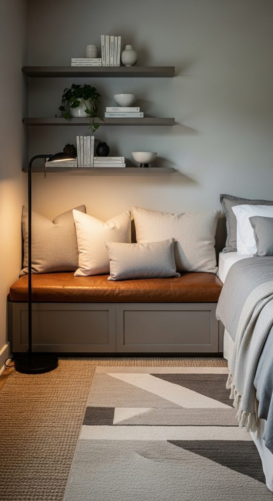 A minimalist bench tucked against a wall becomes a stylish reading spot with a few plush leather cushions. A low-profile side table and a slim floor lamp complete the setup. Neutral or dark tones keep the nook masculine and sleek. Floating shelves or wall-mounted racks can hold books or decorative items. This simple, uncluttered nook emphasizes comfort without overwhelming the bedroom. Ideal for modern bedrooms, it offers a functional and cozy space for reading while maintaining a clean, masculine aesthetic.