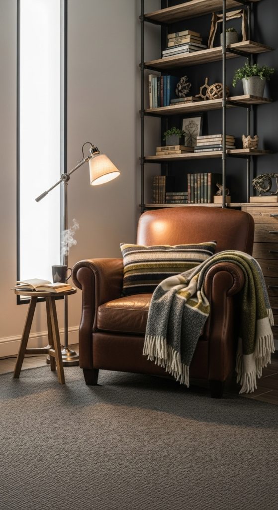 A classic leather armchair tucked into a bedroom corner creates a masculine reading retreat. Pair it with a wooden side table for books and a small lamp for warm lighting. Add a soft throw and a cozy rug to enhance comfort. Industrial-style shelving above or nearby can store favorite reads or decorative items. The rich leather tones combined with dark wood and subtle metals exude sophistication and warmth. This nook is perfect for curling up with a novel, enjoying quiet reflection, or sipping a cup of coffee in style.