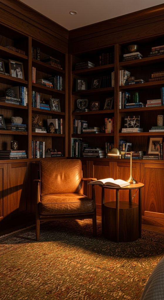 A library-style nook with floor-to-ceiling bookshelves offers a sophisticated reading corner. Add a comfortable armchair or recliner with a side table for beverages. Choose dark wood or leather for a masculine feel. A warm rug and adjustable lighting complete the ambiance. The built-in shelving creates a sense of enclosure, making the nook feel private and intimate. This style is ideal for men who value a traditional and timeless look while enjoying their favorite books in a focused, cozy environment.