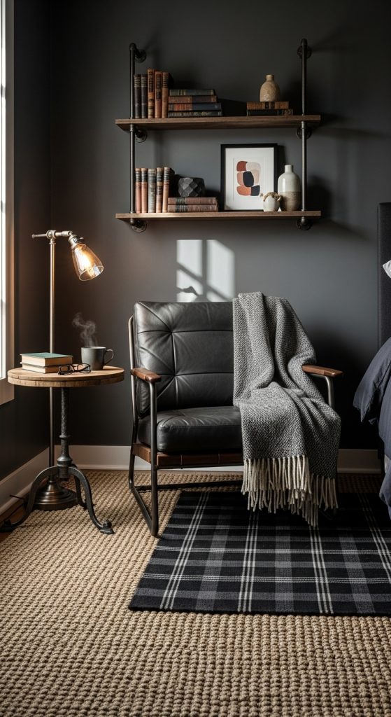 An industrial-style pipe shelving unit creates a masculine backdrop for a reading corner. Place a recliner or cushioned chair in front with a side table and reading lamp. Exposed metal pipes combined with reclaimed wood add texture and visual interest. Layered rugs and throws enhance warmth, while shelves display books and décor. This nook is perfect for urban-inspired bedrooms, offering a cozy yet edgy reading space that complements masculine décor and emphasizes functionality with style.