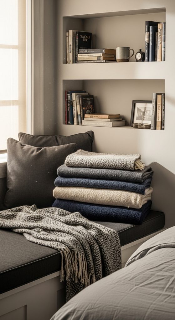 For men who enjoy both gaming and reading, a multifunctional nook works perfectly. Include a comfy armchair, ottoman, and side table for books or controllers. Wall-mounted shelves store books and games. A floor lamp provides soft lighting, and dark tones maintain a masculine feel. This nook balances leisure and focus, offering a personalized retreat where reading and relaxation coexist with modern hobbies. It’s practical, cozy, and stylish, catering to a versatile lifestyle while maintaining a cohesive bedroom aesthetic.
