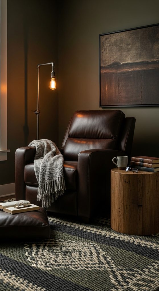 A corner recliner paired with a tall floor lamp creates an intimate reading nook. Add a small side table for drinks or books. Choose leather or dark fabric to maintain a masculine vibe. Include a soft throw and textured rug for warmth. This straightforward yet elegant setup focuses on comfort, allowing men to unwind with a book or magazine. Its simplicity and style make it suitable for bedrooms of all sizes, offering a practical and cozy retreat without unnecessary clutter.