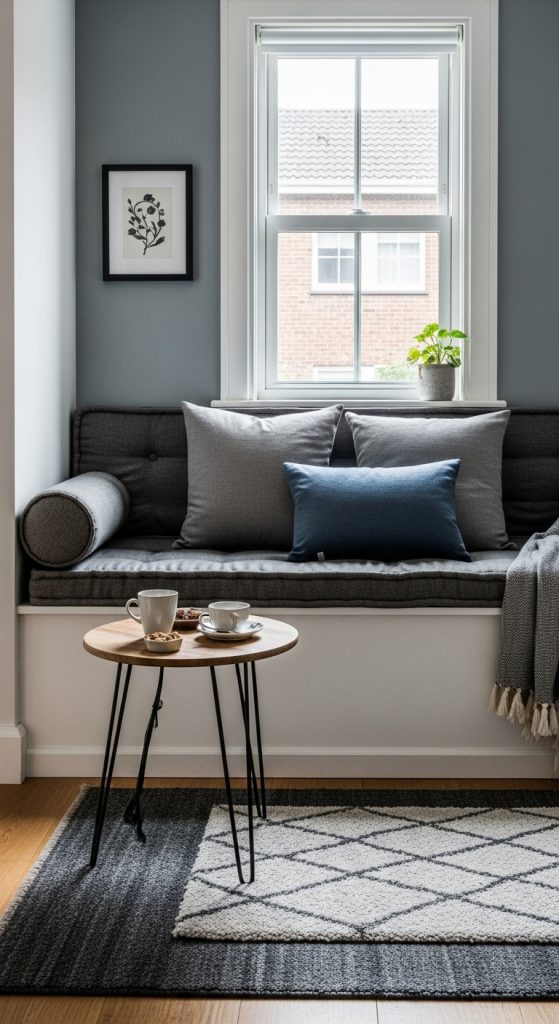 Transform a bedroom window into a cozy reading nook with a built-in seat and dark, masculine cushions. Add layered throws for warmth and texture. Shelving or storage below can house books or personal items. Natural light streams in during the day, while a wall-mounted lamp provides illumination in the evening. Minimalist décor and clean lines keep the space feeling sleek and uncluttered. This window seat offers a serene retreat for quiet reading while taking advantage of views and light, combining functionality with a tailored, masculine aesthetic.