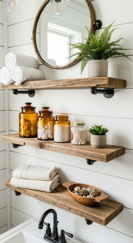 Floating shelves made from reclaimed or stained wood provide open storage and showcase decorative and functional items. They are ideal for bathrooms with limited space and can hold everything from towels to soap dispensers and plants.