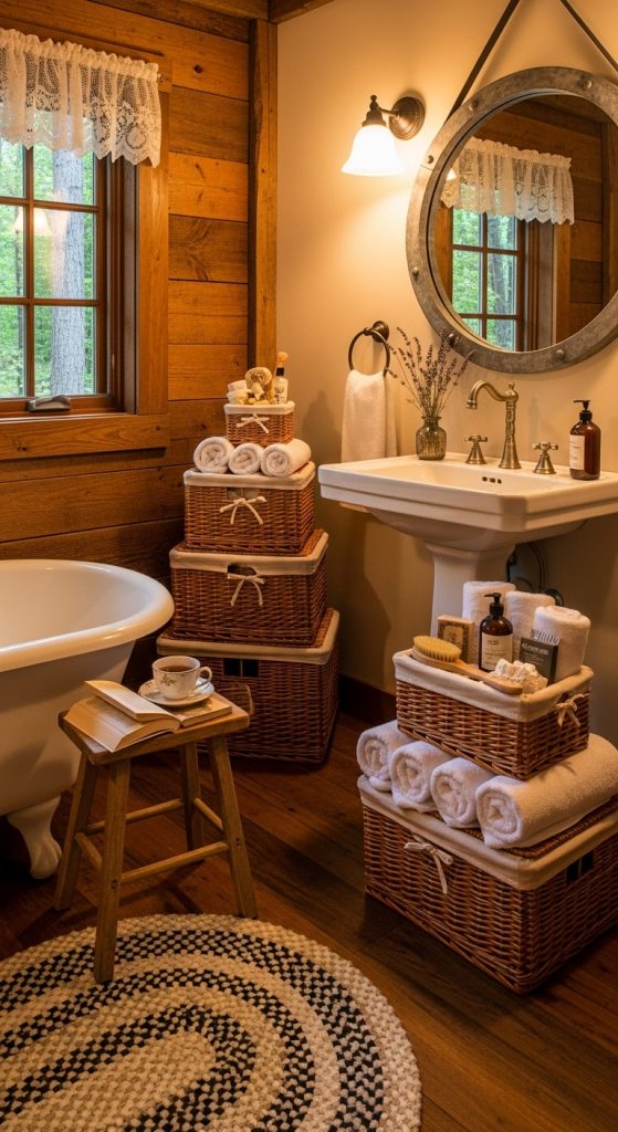 Wicker baskets are perfect for storing towels, hand towels, or extra toiletries. Their natural texture complements a rustic bathroom while keeping items neatly contained and accessible.