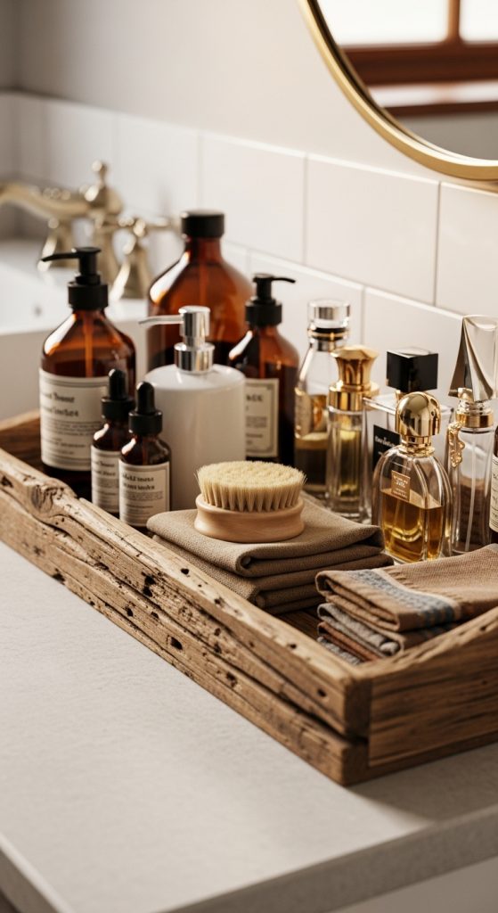 Reclaimed wood trays are perfect for organizing vanity items, perfumes, and cosmetics. They are portable, functional, and bring a natural texture to rustic bathrooms.