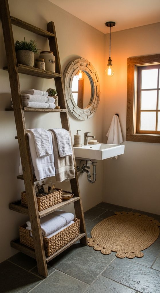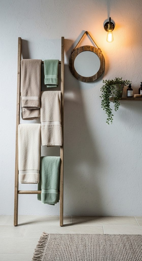 A wooden ladder shelf combines vertical storage with rustic charm. Unlike a simple ladder towel rack, ladder shelves provide multiple surfaces to display towels, baskets, and decor.