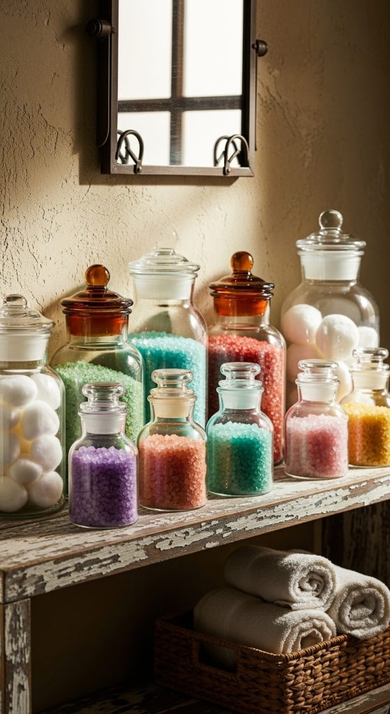 Apothecary jars are ideal for displaying and organizing smaller bathroom essentials like bath salts, cotton swabs, or soaps. Their vintage-inspired design fits perfectly with a rustic bathroom theme.