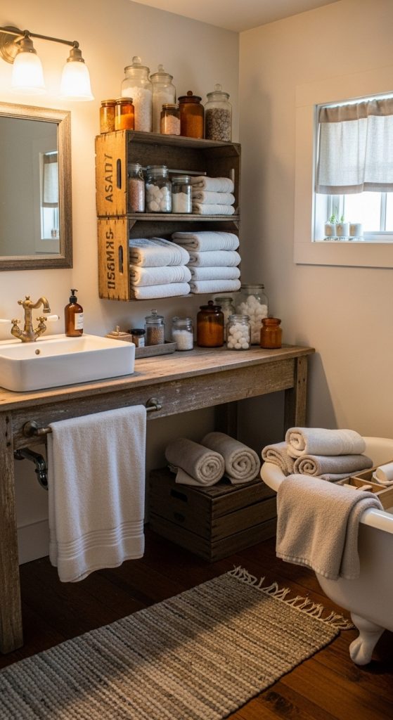 Using vintage wooden crates as shelves or storage units is a simple and effective way to add rustic charm while staying organized. Wooden crates can be mounted on walls to store toiletries, towels, or decorative items, providing both function and aesthetic appeal.