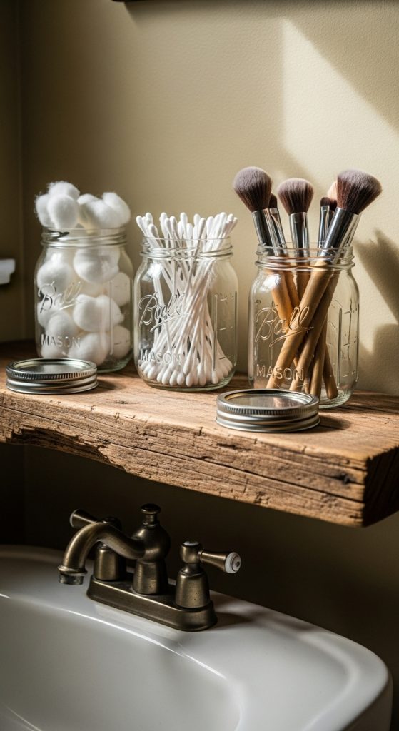Mason jars are a staple of rustic décor and can be used to organize cotton balls, Q-tips, makeup brushes, or toothbrushes. Their transparency allows you to easily see the contents while adding a cozy farmhouse touch.