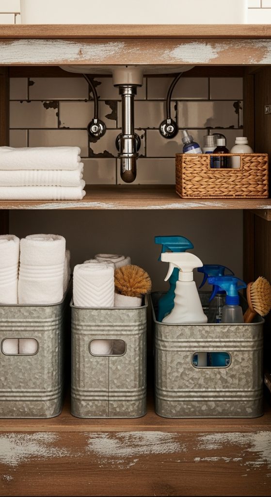 Galvanized metal bins are sturdy, rustic, and perfect for under-sink storage. They hold cleaning supplies, extra toilet paper, or bathroom accessories while adding industrial rustic charm.