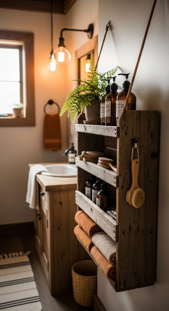 By combining functionality and rustic charm, these organization ideas help create a cozy, clutter-free bathroom where everything has a place and every design element adds warmth and character.