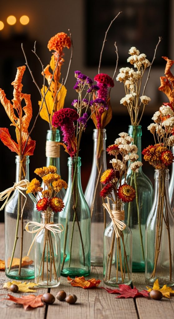 For added charm, use bottles of different heights and sizes, and mix in seasonal flowers like dahlias and chrysanthemums. This arrangement is perfect for creating a rustic, cozy ambiance in any space.