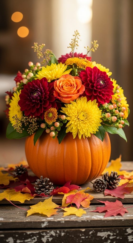 What better way to incorporate the season’s signature fruit than by using a pumpkin vase as the base for a floral arrangement? This unique fall idea combines the natural beauty of pumpkins with fresh flowers and seasonal foliage. To make this arrangement, choose a medium to large pumpkin and carve out the top to create a vase.