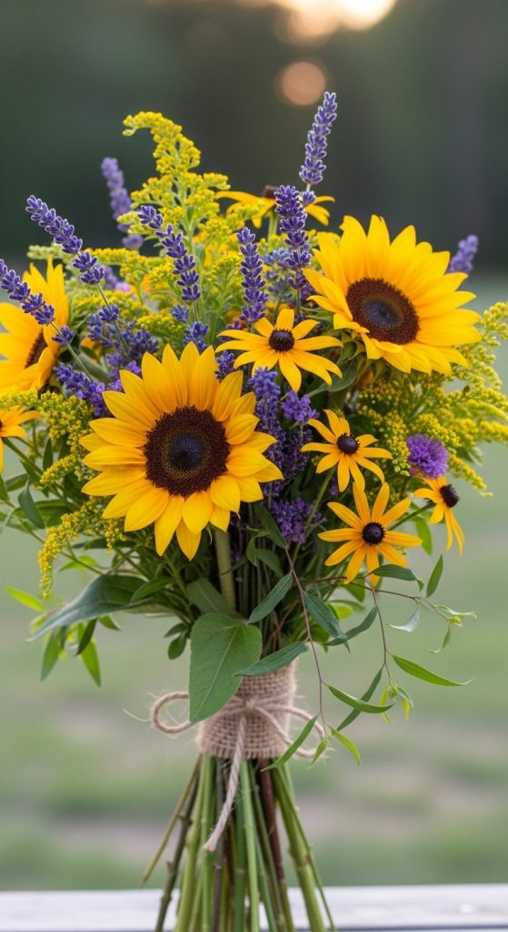 For a more carefree and natural look, a wildflower fall bouquet embraces the earthy beauty of the outdoors. This arrangement is all about texture and variety, so feel free to mix wildflowers, daisies, black-eyed Susans, and lavender with seasonal foliage.