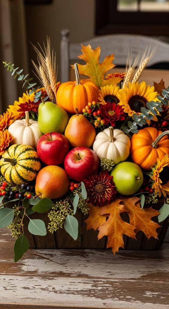 A beautiful and natural way to celebrate fall is by combining fruits with your floral arrangements. Apples, pears, and pomegranates can be arranged alongside roses, sunflowers, or chrysanthemums. The addition of fruit adds texture and vibrant color, turning your arrangement into both a visual and edible delight.