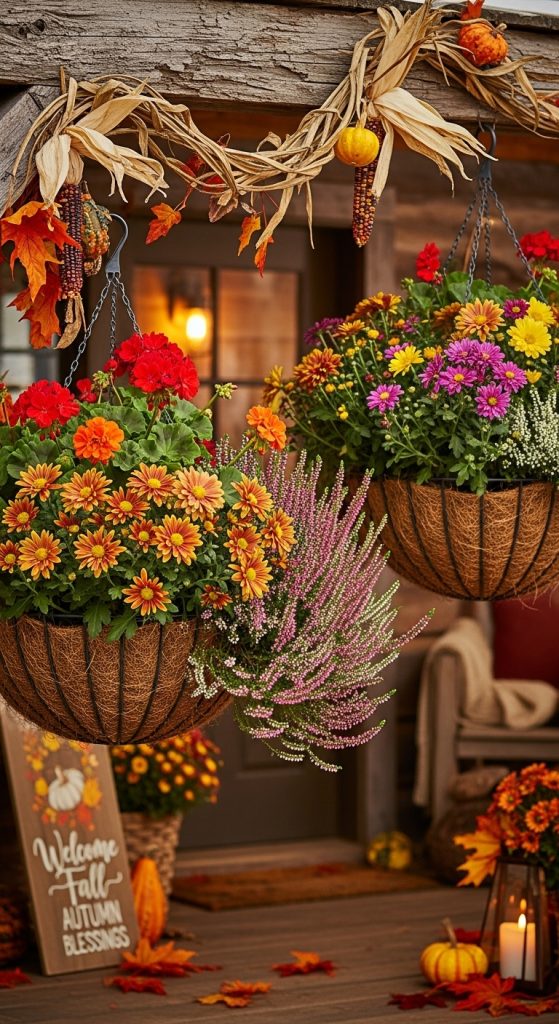 For an extra seasonal touch, incorporate ivy, fall berries, and autumn leaves. Hang these baskets on your porch or inside, creating a stunning visual that complements your fall décor. The movement and flow of the flowers will bring life and color to any room.