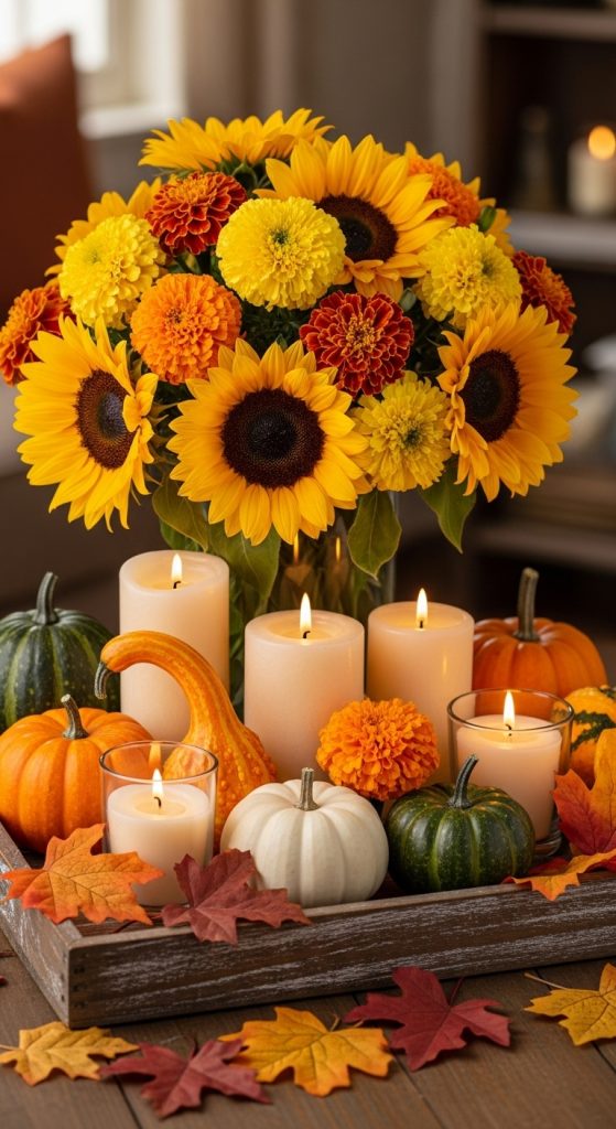 Surround the candles with a selection of fall flowers, such as sunflowers, zinnias, and marigolds, and fill in the gaps with fall foliage, pumpkins, or acorns. This combination will create a cozy, autumnal atmosphere perfect for entertaining or creating a calming environment at home.