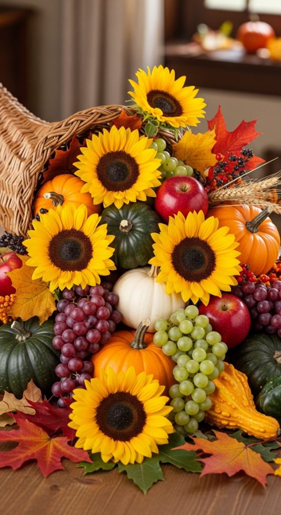 Fill your cornucopia with fall flowers like sunflowers, dahlias, mums, and wildflowers. Then add pumpkins, gourds, grapes, apples, and corn husks to complete the harvest look. This vibrant and bountiful arrangement celebrates the beauty and abundance of the fall season, making it the perfect centerpiece for your holiday table.