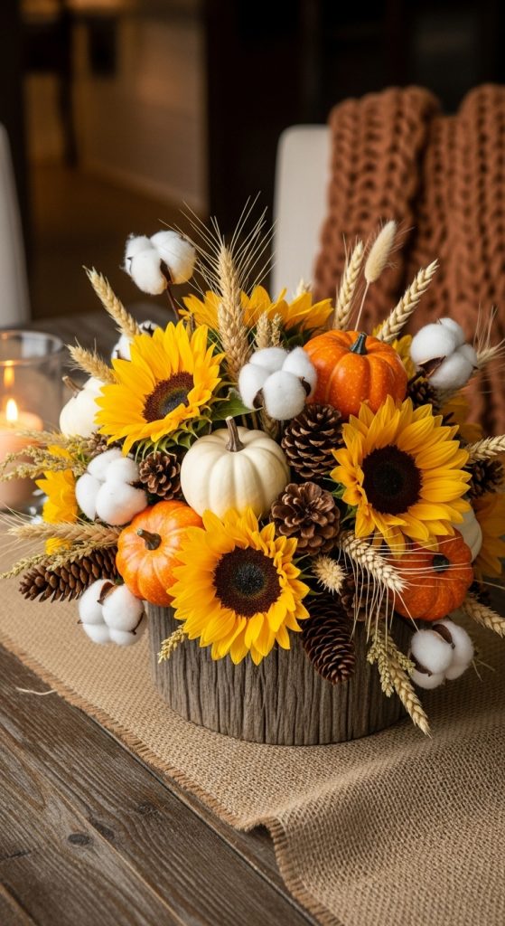 Start by arranging sunflowers in a wide, low vase, and then tuck in dried wheat stalks to add texture. For extra fall flair, incorporate branches of cotton, small pumpkins, or even a few pinecones to complete the look. This combination will give your space a cozy, farmhouse-inspired aesthetic that’s perfect for your dining table or coffee table.