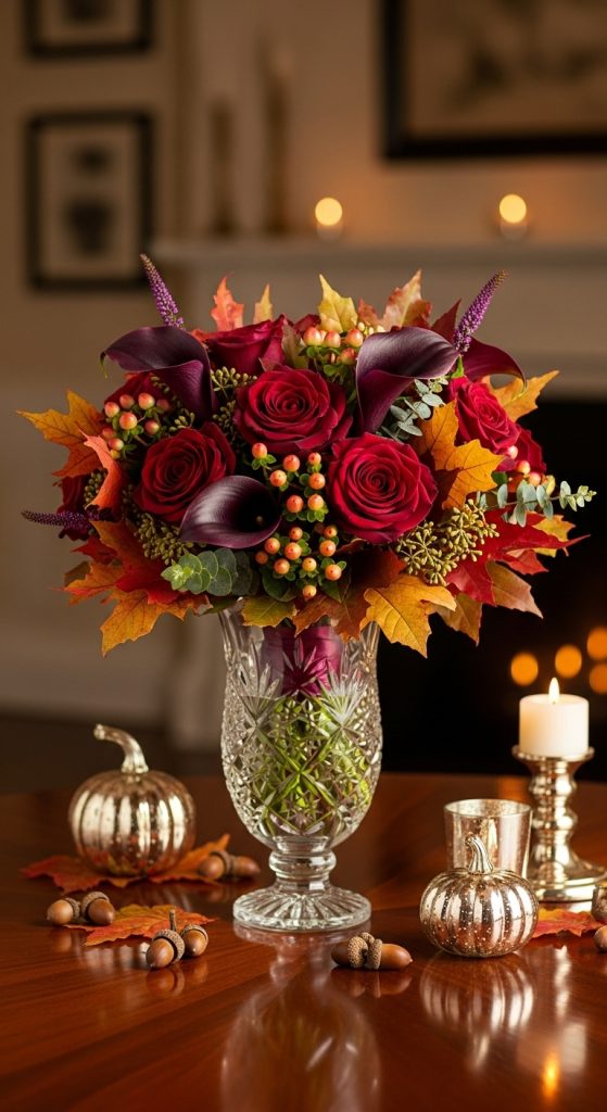 If you’re looking for something more refined for your home, an elegant fall bouquet with roses, calla lilies, and orchids will add sophistication to any room. These flowers come in rich, deep colors like burgundy, plum, and chocolate brown, making them perfect for autumn.